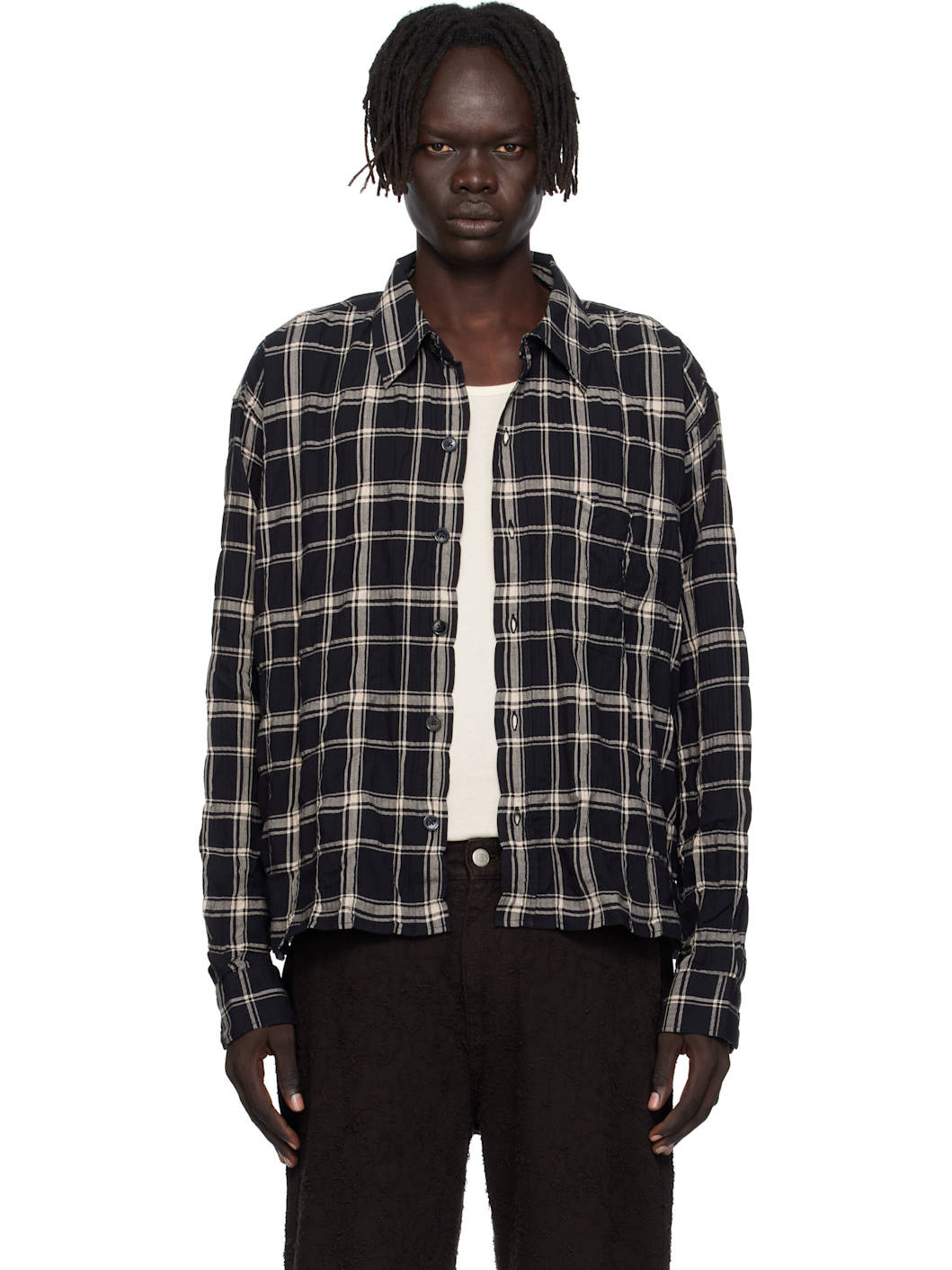 Crinkled stretch cotton herringbone shirt. · Check pattern throughout · Spread collar · Button closure · Patch pocket at chest · Adjustable buttoned barrel cuffs · Box pleat at back yoke Available exclusively at SSENSE. Supplier color: Carpenter check 99% cotton, 1% elastane. Made in Portugal 252505M192000