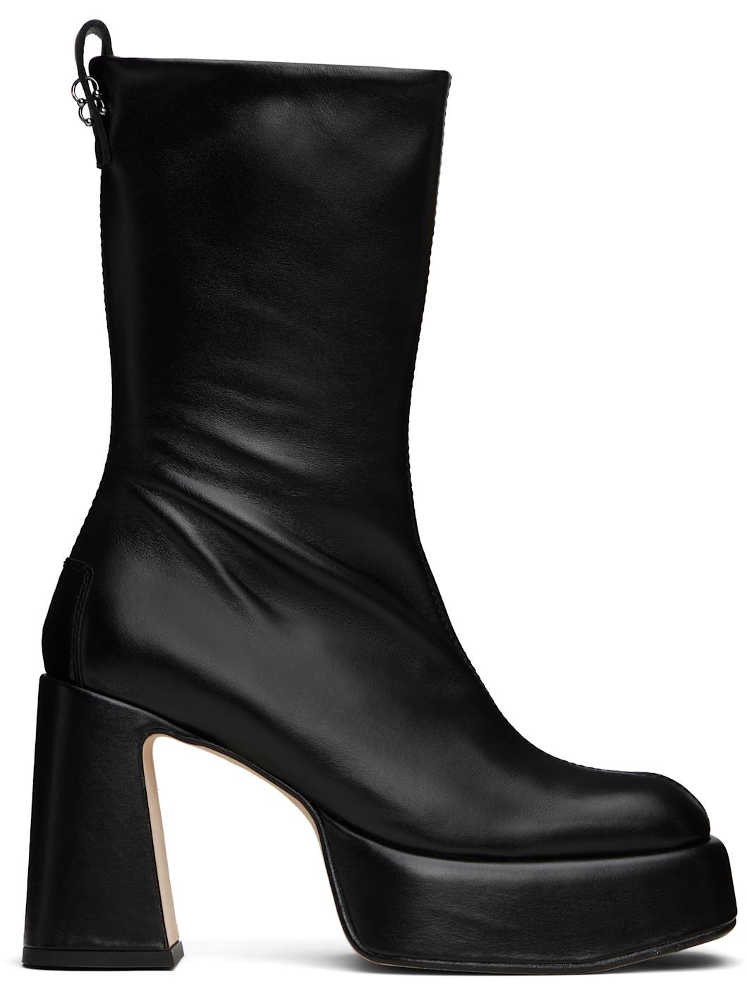 Ankle-high grained leather boots. · Square toe · Zip closure at inner side · Pull-loop and charms at collar · Covered platform midsole · Covered block heel with rubber injection · Suede sole · Platform: H1.75" · Heel: H4" Supplier color: Pure black Upper: leather. Sole: leather, rubber. Made in Spain 251877F114002