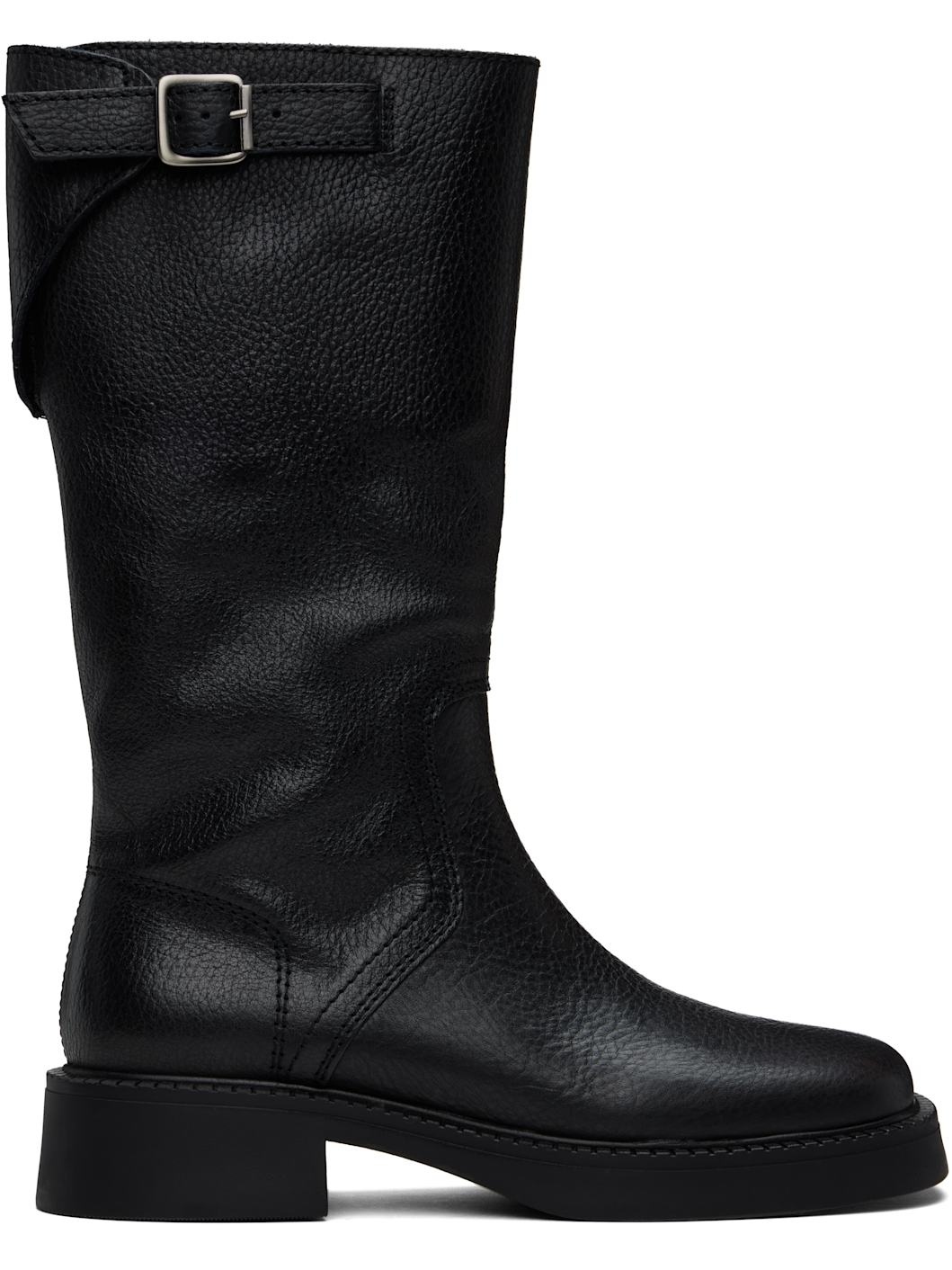 Mid-calf pebble-grained leather boots in black. · Square toe · Adjustable pin-buckle tab at collar · Buffed faux-leather lining · Serrated edge at welt · Foam rubber midsole · Treaded rubber sole · Heel: H1.5" Supplier color: Black Upper: leather. Sole: rubber. Made in Portugal 242877F114008