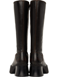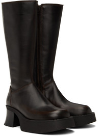 Calf-high buffed leather boots in brown. · Square toe · Elasticized gusset and zip closure at inner side · Logo embossed at outer heel · Serrated detailing at welt · Faux-leather lining · Stacked leather block heel · Treaded rubber sole · Platform: H1.25" · Heel: H2" Supplier color: Brown black Upper: leather. Sole: rubber. Made in Portugal 251877F115003