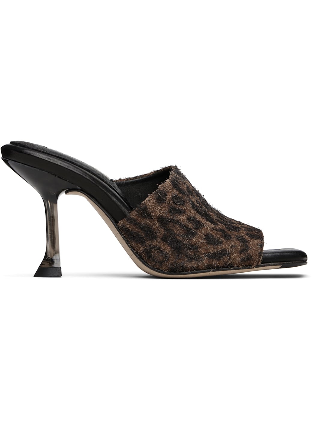 Brushed suede mules. · Leopard pattern printed throughout · Open square toe · Strap at vamp · Logo patch at padded leather footbed · Semi-transparent spool heel · Suede sole with rubber injection · Heel: H3.25" Supplier color: Brown Upper: leather. Sole: leather, rubber. Made in Spain 251877F125003