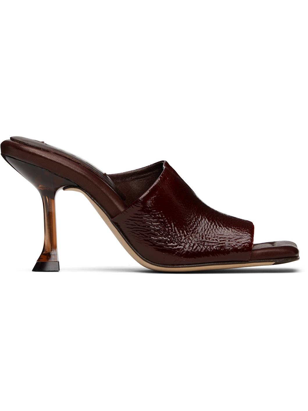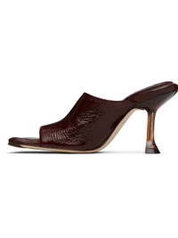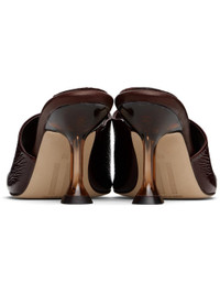 Brushed suede mules. · Open square toe · Strap at vamp · Logo patch at padded leather footbed · Semi-transparent spool heel · Suede sole with rubber injection · Heel: H3.25" Supplier color: Brown Upper: leather. Sole: leather, rubber. Made in Spain 251877F125001