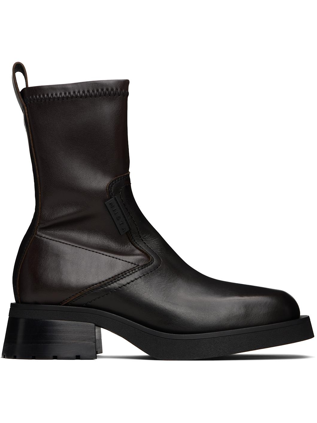Ankle-high grained leather and faux-leather boots. · Square toe · Rubberized logo flag at vamp · Zip closure at inner side · Pull-loop at collar · Stacked leather block heel with rubber injection · Rubber sole · Heel: H2" Supplier color: Brown Upper: leather, synthetic. Sole: leather, rubber. Made in Portugal 251877F113000