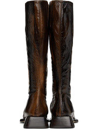 Knee-high crinkled patent sheepskin boots in brown. · Square moc toe · Zip closure at inner side · Concealed elasticized gusset at inner collar · Memory foam insole · Buffed leather lining · Stacked leather block heel with rubber injection · Leather sole with rubber injection · Heel: H1.5" Supplier color: Brown Upper: sheepskin. Sole: leather, rubber. Made in Spain 242877F115001