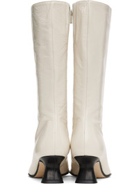 Calf-high polished crinkled leather boots in white. · Pointed square toe · Zip closure at inner side · Concealed elasticized gusset at inner collar · Grained leather lining · Covered heel with rubber injection · Nubuck sole with rubber injection · Heel: H2.25" Supplier color: Off-white Upper: leather. Sole: leather, rubber. Made in Spain 242877F114019