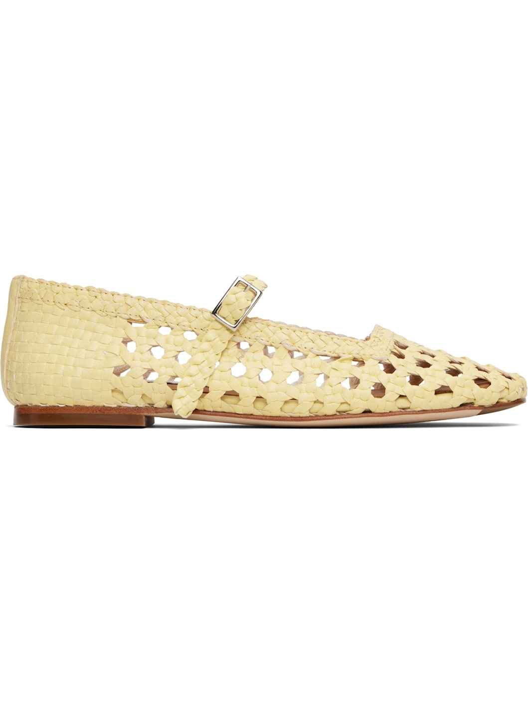 Hand-woven grained leather Mary Jane-style ballerina flats. · Square toe · Elasticized pin-buckle strap at vamp · Logo patch at padded footbed · Unlined · Leather sole with rubber injections Supplier color: Butter Upper: leather. Sole: leather, rubber. Made in Spain 251877F118004