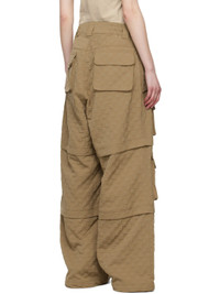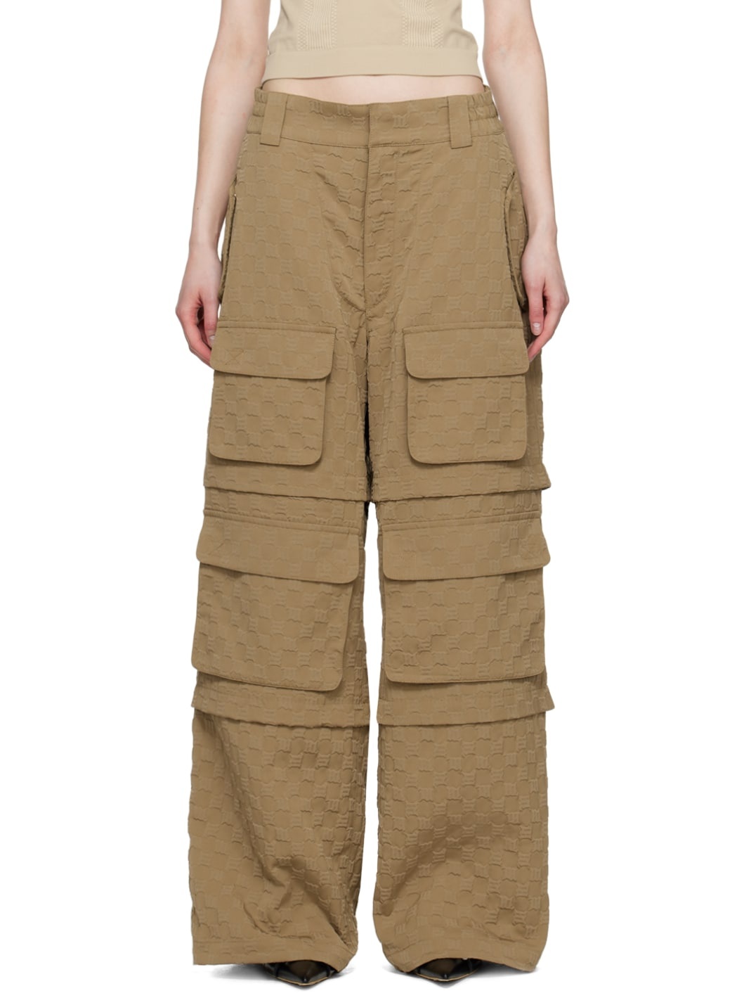 Recycled polyester canvas trousers. Logo pattern embossed throughout. · Belt loops at elasticized waistband · Four-pocket styling · Zip-fly · Flap pockets at front Part of the MISBHV x Jordan Barrett collaboration. Wholesale exclusivity at SSENSE. Supplier color: Olive 100% recycled polyester. Made in Poland 232937F087000