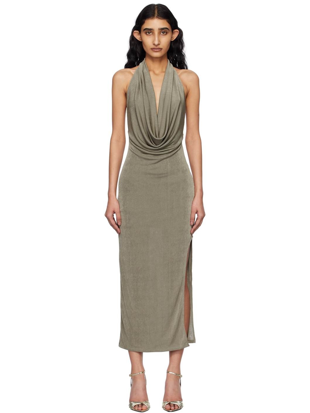Knit stretch polyester maxi dress. · Plunging cowl neck · Slit at side · Fixed halter strap · Low back · Partially lined Supplier color: Silver 97% polyester, 3% elastane. Made in Poland 251937F055002