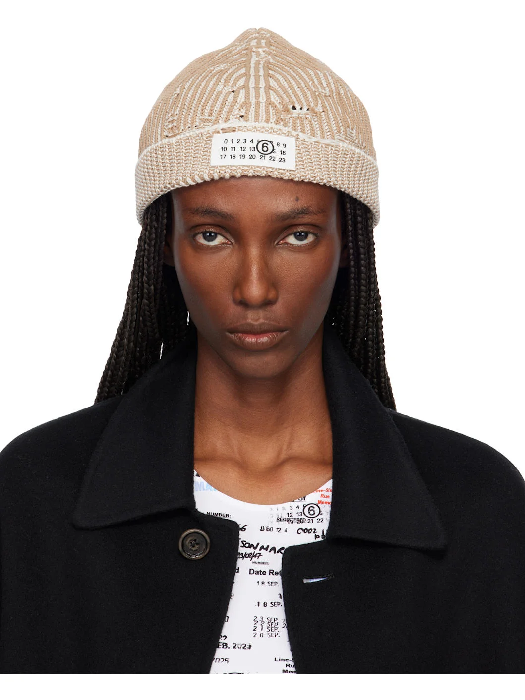 7-gauge rib-knit cotton beanie. · Distressing throughout · Logo patch at rolled brim Supplier color: Camel/Chalk 100% cotton. Made in Italy 261188F014002