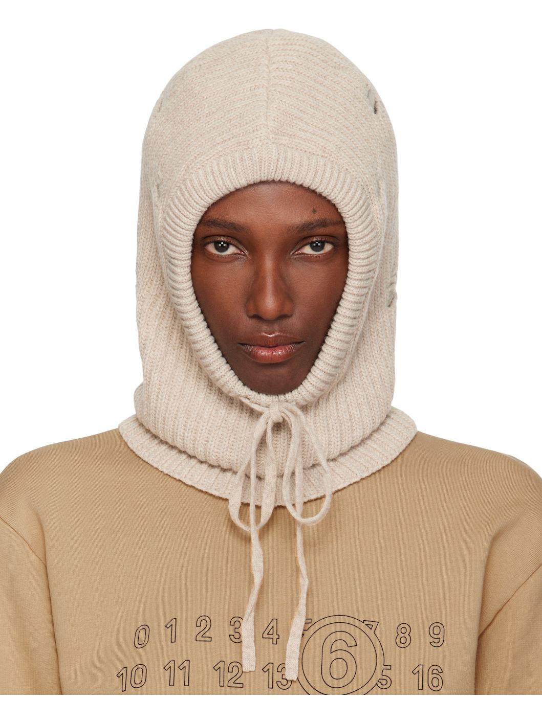 Rib-knit wool-blend hood. · Distressing throughout · Drawstring at face · Logo patches at back face Supplier color: Nude 80% wool, 20% polyamide. Made in Italy 252188F014000