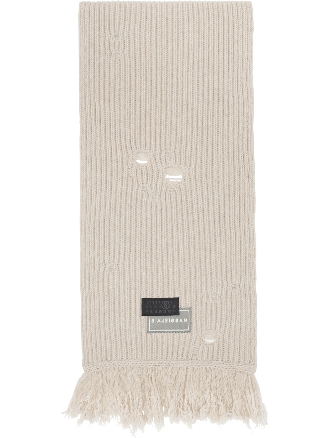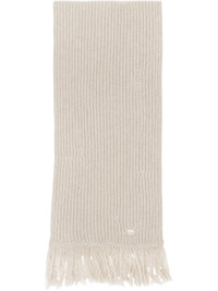 5-gauge knit wool-blend scarf. · Distressing throughout · Logo patch at face · Fringed detailing at ends · L92" x W11" Supplier color: Beige 80% wool, 20% polyamide. Made in Italy 252188F028001