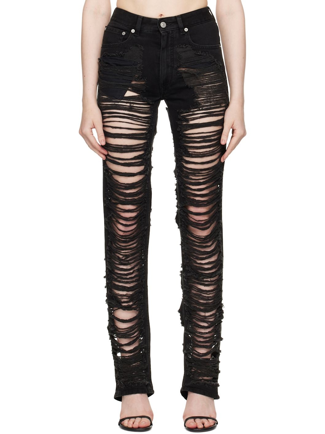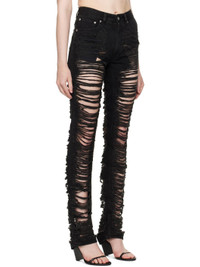 Non-stretch denim jeans. Fading, distressing, and laddering throughout. · Belt loops · Five-pocket styling · Zip fly · White stitching at back waist · Logo patch at back pocket · Logo-engraved silver-tone hardware Supplier color: Black Body: 100% cotton. Lining: 65% polyester, 35% cotton. Made in Italy 251188F069022