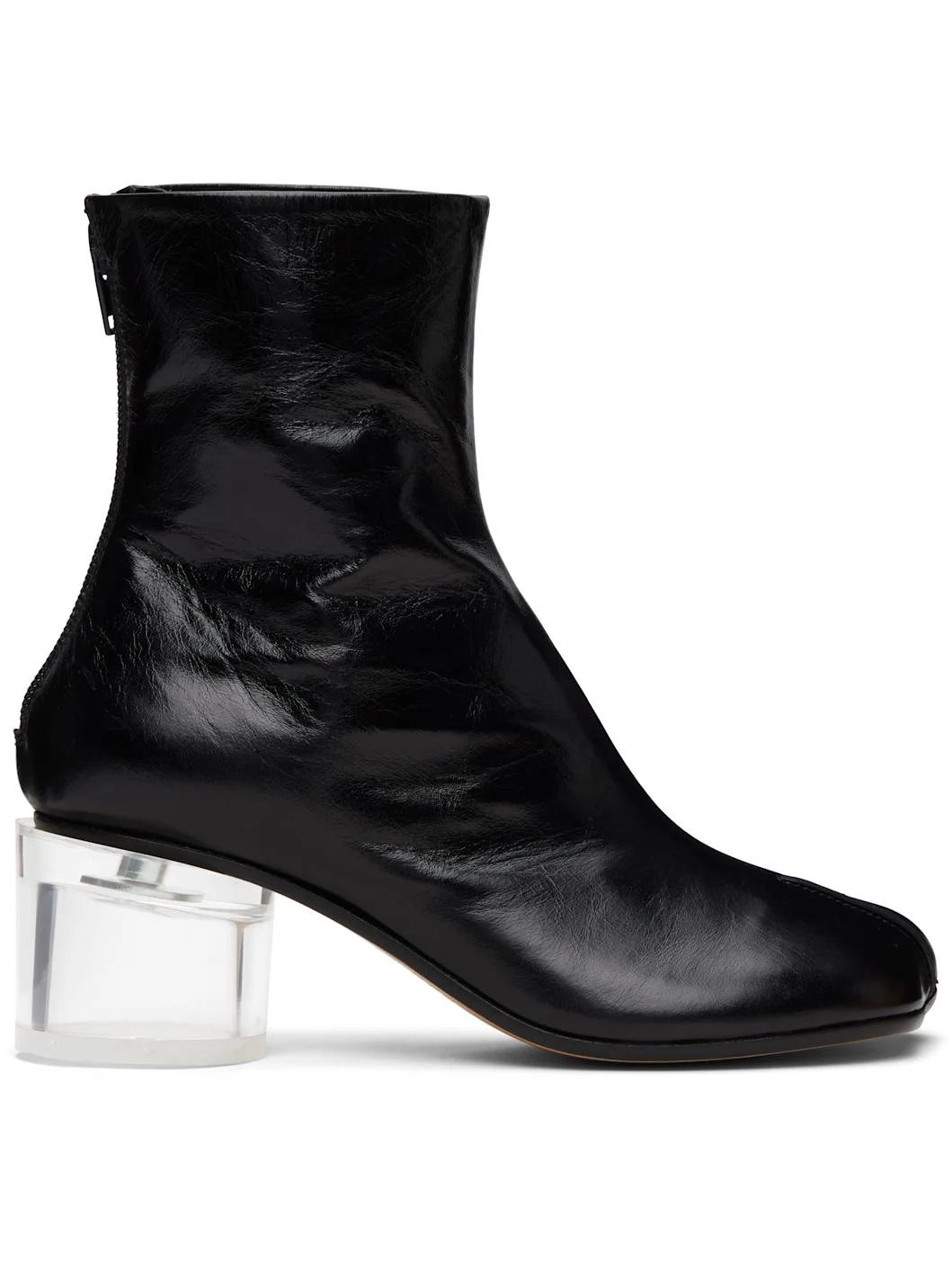 Ankle-high creased calfskin boots. · Pinched seam at modified square toe · Zip closure at heel · Buffed calfskin lining · Transparent polymer block heel with rubber injection · Calfskin sole · Heel: H2.25" Supplier color: Black Upper: calfskin. Sole: calfskin, rubber. Made in Italy 261188F113005