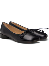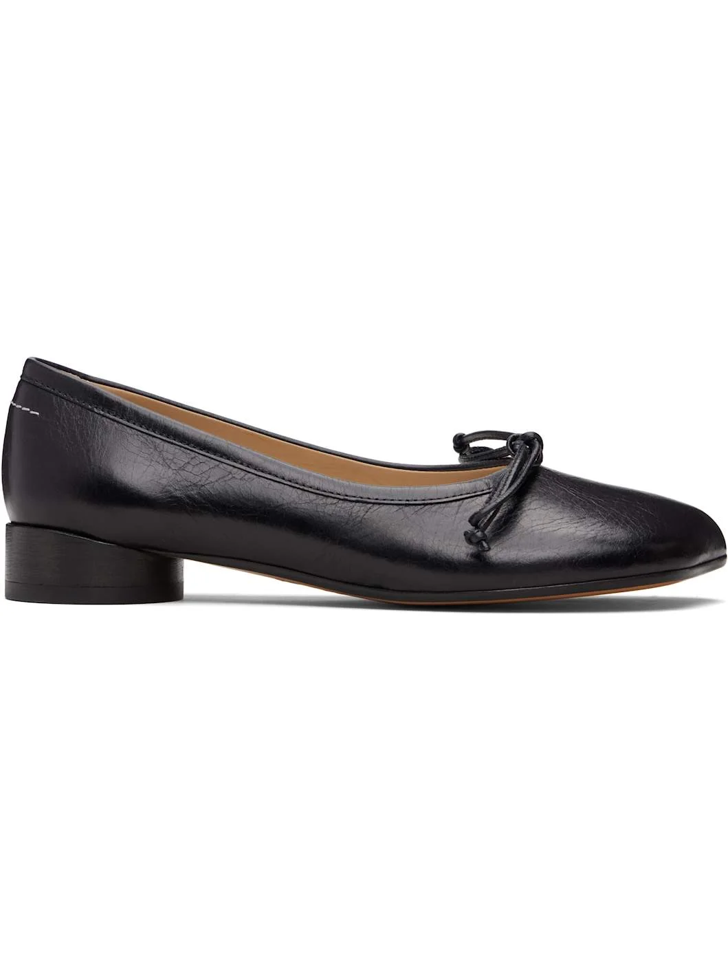 Grained calfskin ballerina flats. · Modified square toe · Bow accent at vamp · Signature white stitching at heel tab · Buffed calfskin lining · Stacked leather block heel with rubber injection · Calfskin sole · Heel: H1" Supplier color: Black Upper: calfskin. Sole: calfskin, rubber. Made in Italy 261188F122000
