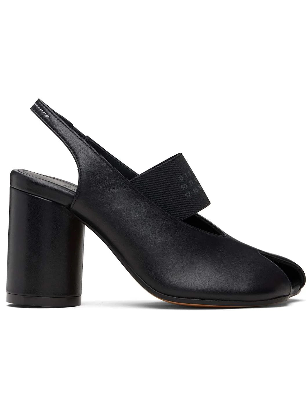 Buffed sheepskin heels. · Modified open square toe · Logo-printed elasticized strap at vamp · Partially elasticized slingback strap · Signature white stitching at slingback strap · Buffed calfskin lining · Covered cylindrical heel with rubber injection · Calfskin sole · Heel: H3.25" Supplier color: Black Upper: sheepskin. Sole: calfskin, rubber. Made in Italy 261188F122006