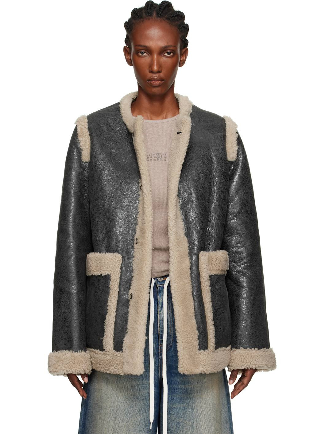 Cracked lambskin jacket. · Shearling trim throughout · Round neck · Hook-eye closure · Patch pockets at front · White stitching at back collar · Welt pockets at interior · Shearling interior Supplier color: Beige/Black 100% lambskin. Made in Italy 252188F062000