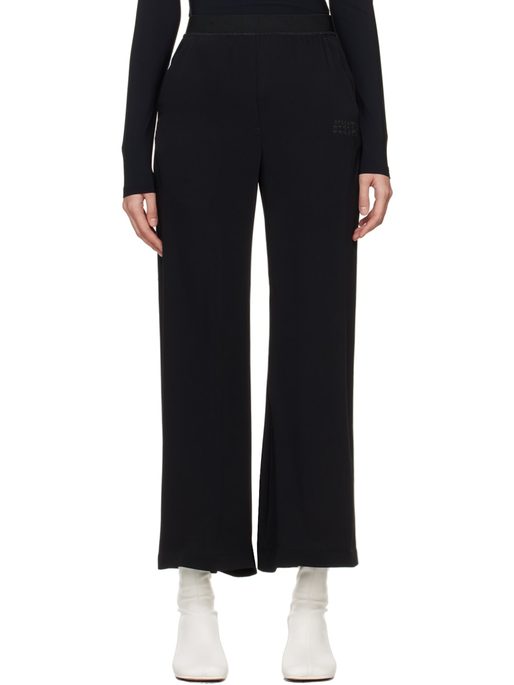 Polyester sateen trousers. · Elasticized waistband · Two-pocket styling · Mock-fly · Logo graphic embroidered at leg · White stitching at back Supplier color: Black 100% polyester. Made in Italy 241188F087000