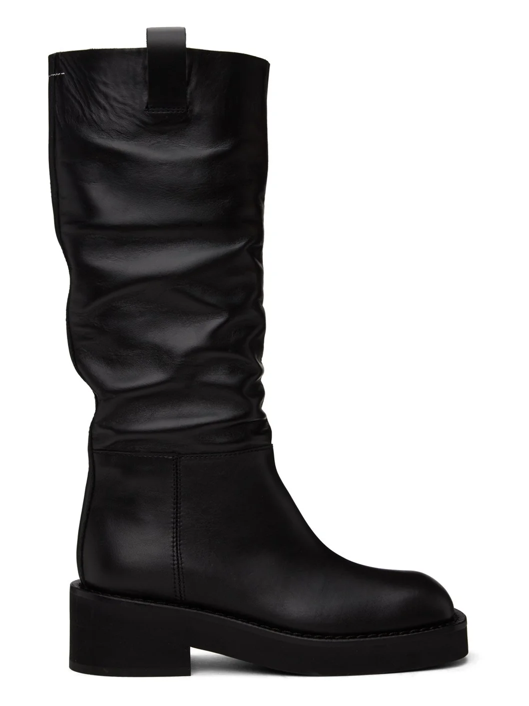 Knee-high buffed calfskin boots in black. · Square toe · Twin pull-loops at collar · Signature white stitching at collar · Calfskin lining · Rubber block heel and outsole · Heel: H2.25 in Supplier color: Black