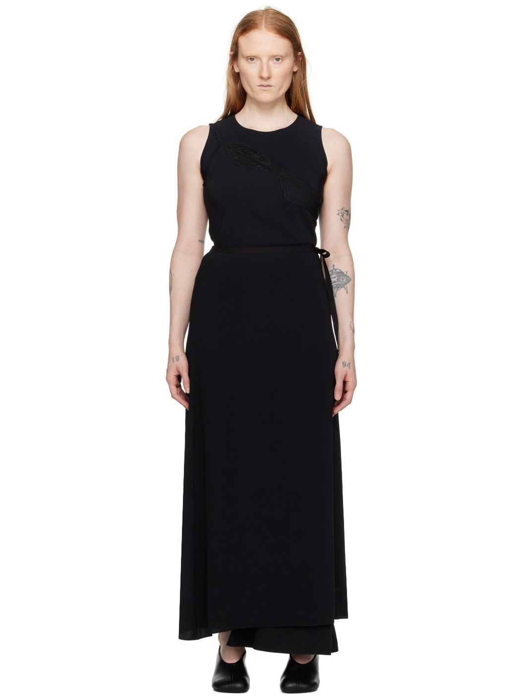 Polyester jersey and stretch nylon-blend jersey dress. · Layered and wrap construction · Crewneck · Lace trim at asymmetric neck and armscye · Self-tie fastening at open side seam · Adjustable spaghetti strap · White stitching at back Supplier color: Black/Black
