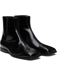 Ankle-high polished calfskin boots. · Square toe · Logo embossed at outer side · Zip closure at inner side · White stitching at heel collar · Buffed calfskin lining · Calfskin sole with rubber injection Supplier color: Black Calfskin. Made in Italy 261188M228000
