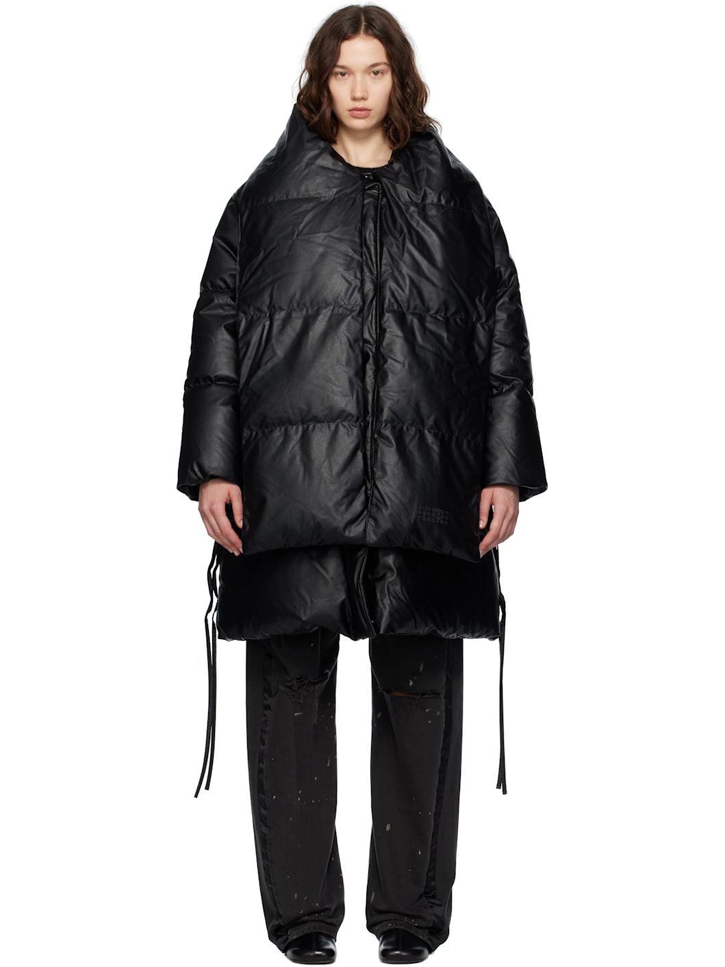 Down-filled and quilted faux-leather jacket. · Integrated logo-embroidered scarf at collar · Two-way zip closure with press-stud placket · Flap pockets · Self-tie fastening at waist · Inset rib-knit cuffs · White stitching at back collar · Full viscose satin lining Supplier color: Black Fill: 90% duck down, 10% duck feather. Body: 100% viscose. Trim: 100% polyurethane. Lining: 100% viscose. Made in Italy 252188F061002