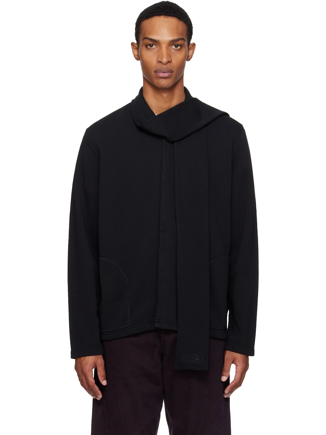 Cotton-blend jersey jacket. · Integrated logo-embroidered scarf · Concealed button closure · Seam pockets · White stitching at back Supplier color: Black 66% cotton, 34% polyester. Made in Italy 252188M213016