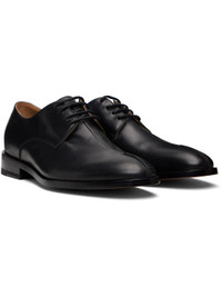 Buffed calfskin derbys. · Pinched seam at toe · Lace-up closure · Logo embossed at tongue · White stitching at heel collar · Buffed calfskin and calfskin suede lining · Stacked calfskin sole with rubber injection Supplier color: Black Calfskin. Made in Italy 252188M225001