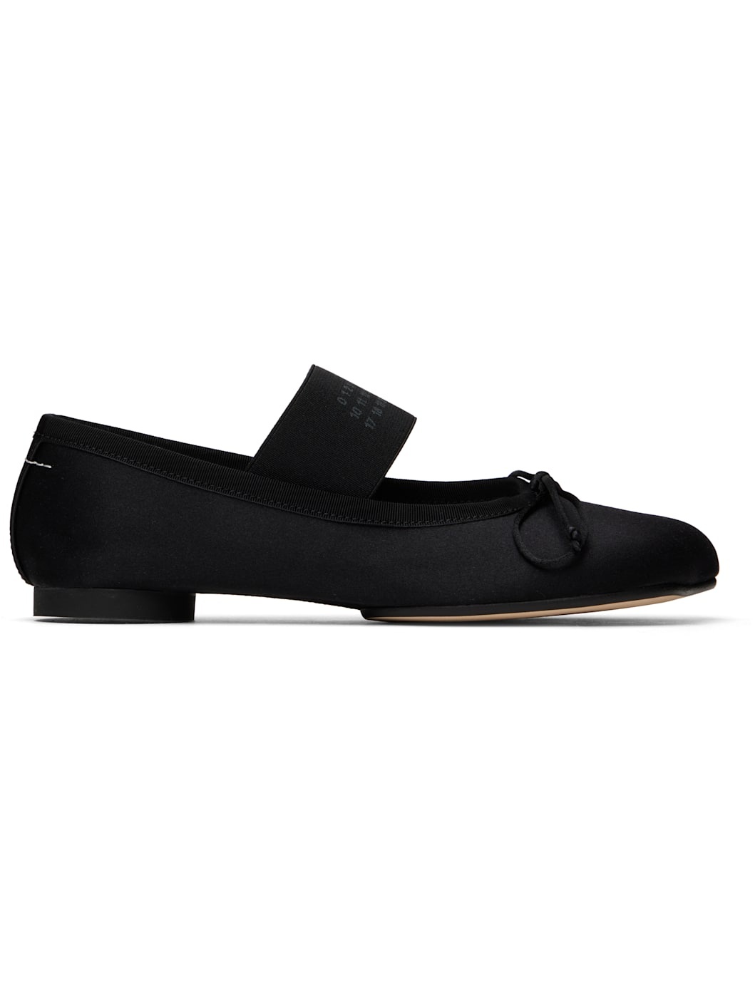 Satin ballerina flats in black. · Molded square toe · Bow accent at vamp · Logo-printed elasticized strap · Grosgrain trim at collar · Signature white stitch at heel · Logo embossed at padded goatskin footbed · Twill lining · Logo-embossed rubber cylindrical heel · Calfskin sole Supplier color: Black Upper: textile. Sole: rubber. Made in Italy 251188F118006