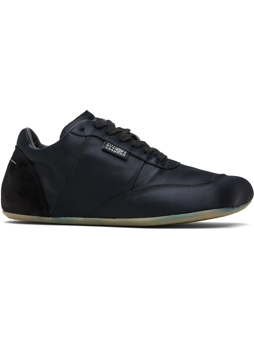 Low-top satin sneakers. · Modified square toe · Lace-up closure · Padded tongue and collar · Logo flag at outer side · White stitching at suede heel counter · Buffed calfskin lining · Treaded rubber sole Supplier color: Black Upper: textile. Sole: rubber. Made in Italy 261188F128005