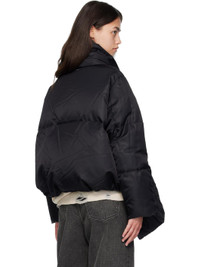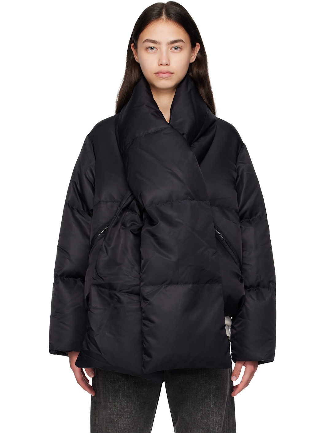 Down-filled and quilted nylon twill jacket. · Integrated scarf at stand collar · Concealed two-way zip closure · Press-stud placket · Zip pockets at front · Cord-lock drawstring at hem · Inset rib-knit cuffs · White stitching at back collar · Full satin lining Supplier color: Black Fill: 90% duck down, 10% duck feather. Body: 100% polyamide. Lining 1: 100% polyamide. Lining 2: 100% cotton. Made in Italy 252188F061001