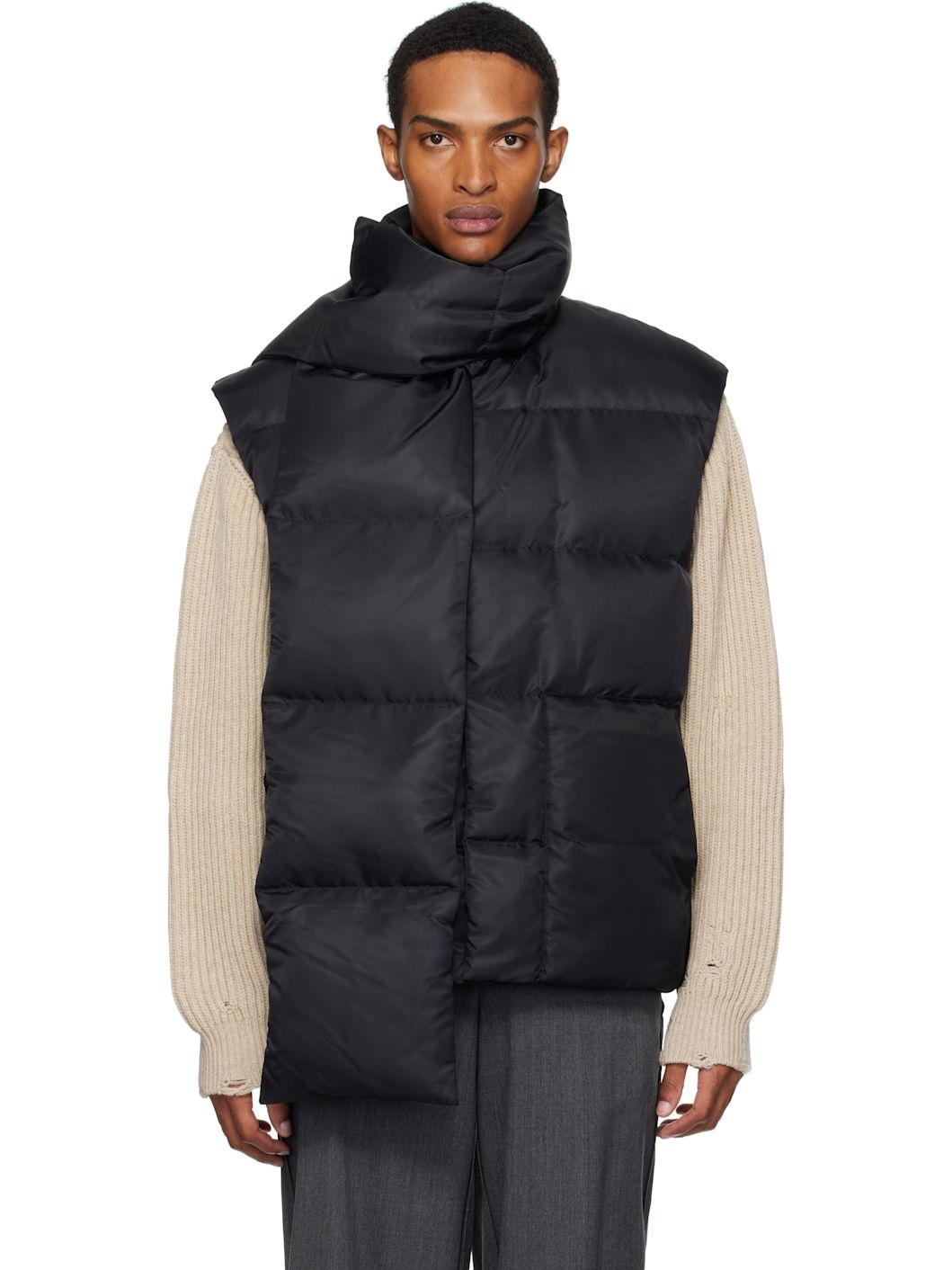 Down-filled and quilted nylon twill vest. · Integrated scarf at stand collar · Zip closure · Concealed press-stud placket · Patch pockets at front · White stitching at back collar · Zip pocket at interior · Full satin lining Supplier color: Black Fill: 90% duck down, 10% duck feather. Body: 100% polyamide. Lining: 100% polyamide. Made in Italy 252188M178000