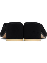 Bonded jersey heeled sandals in black. · Open modified square toe · Thong-style strap at vamp · Logo embossed at padded leather footbed · Covered cylindrical heel with rubber injection · Nubuck sole · Heel: H2.5" Supplier color: Black Upper: textile. Sole: leather, rubber. Made in Italy 251188F125000