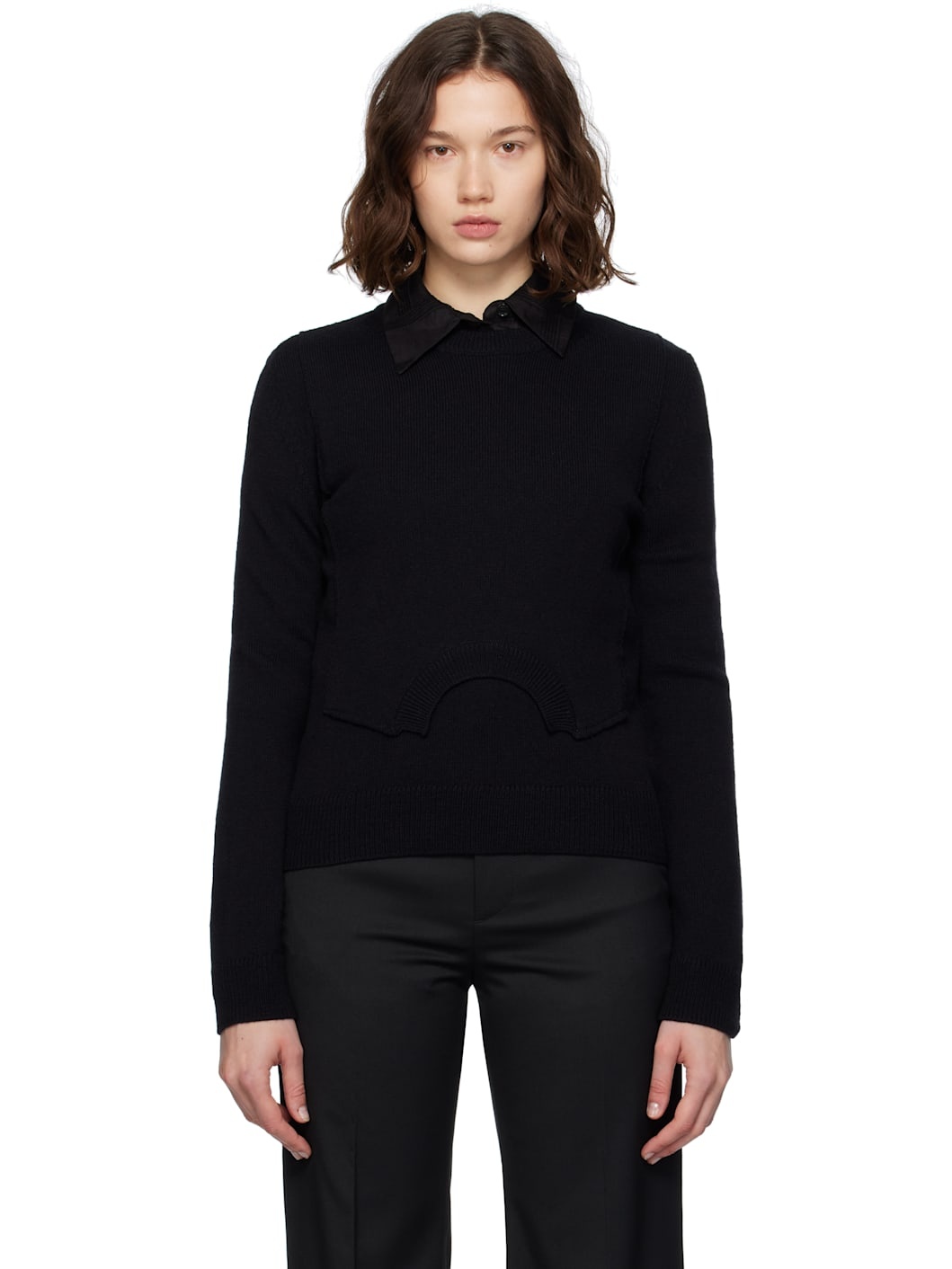 Knit virgin wool sweater. · Layered construction · Rib-knit crewneck, hem, and cuffs · Rib-knit crewneck at hem · White stitching at back collar Supplier color: Black 100% wool. Made in Romania 252188F096008