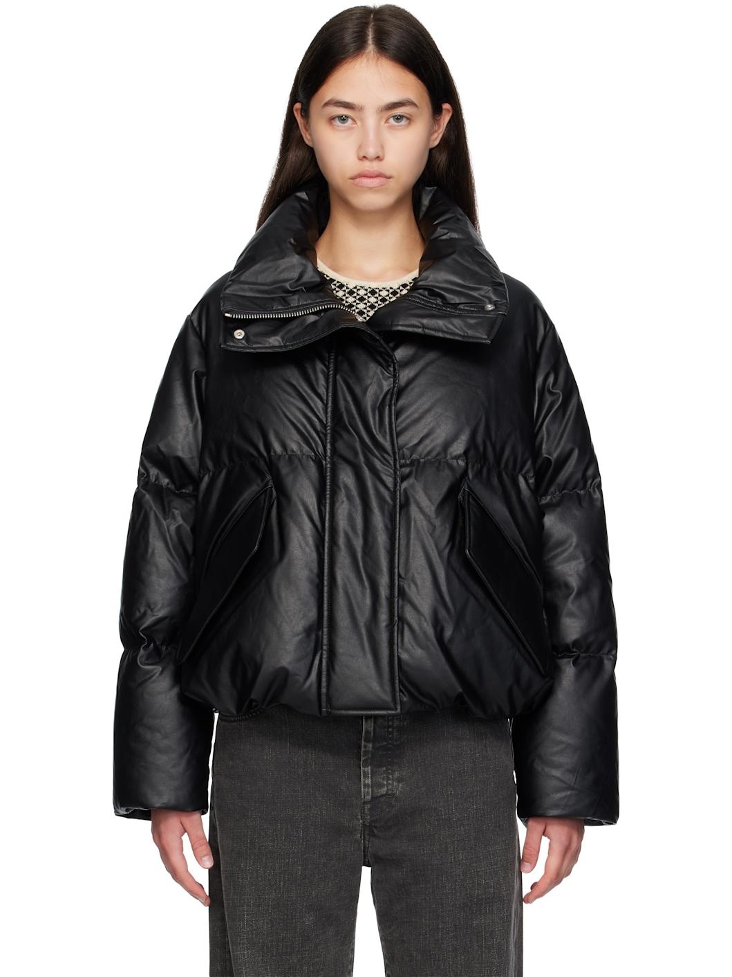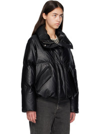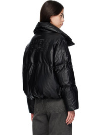 Down-filled and quilted grained faux-leather jacket. · Stand collar · Concealed two-way zip closure · Press-stud placket · Flap pockets at front · Cord-lock drawstring at hem · Inset rib-knit cuffs · White stitching at back collar · Logo embroidered at back · Full satin lining Supplier color: Black Fill: 90% duck down, 10% duck feather. Body: 100% viscose. Body 2: 100% polyurethane. Lining 1: 100% polyamide. Lining 2: 100% cotton. Made in Italy 252188F061000