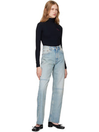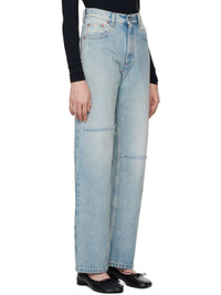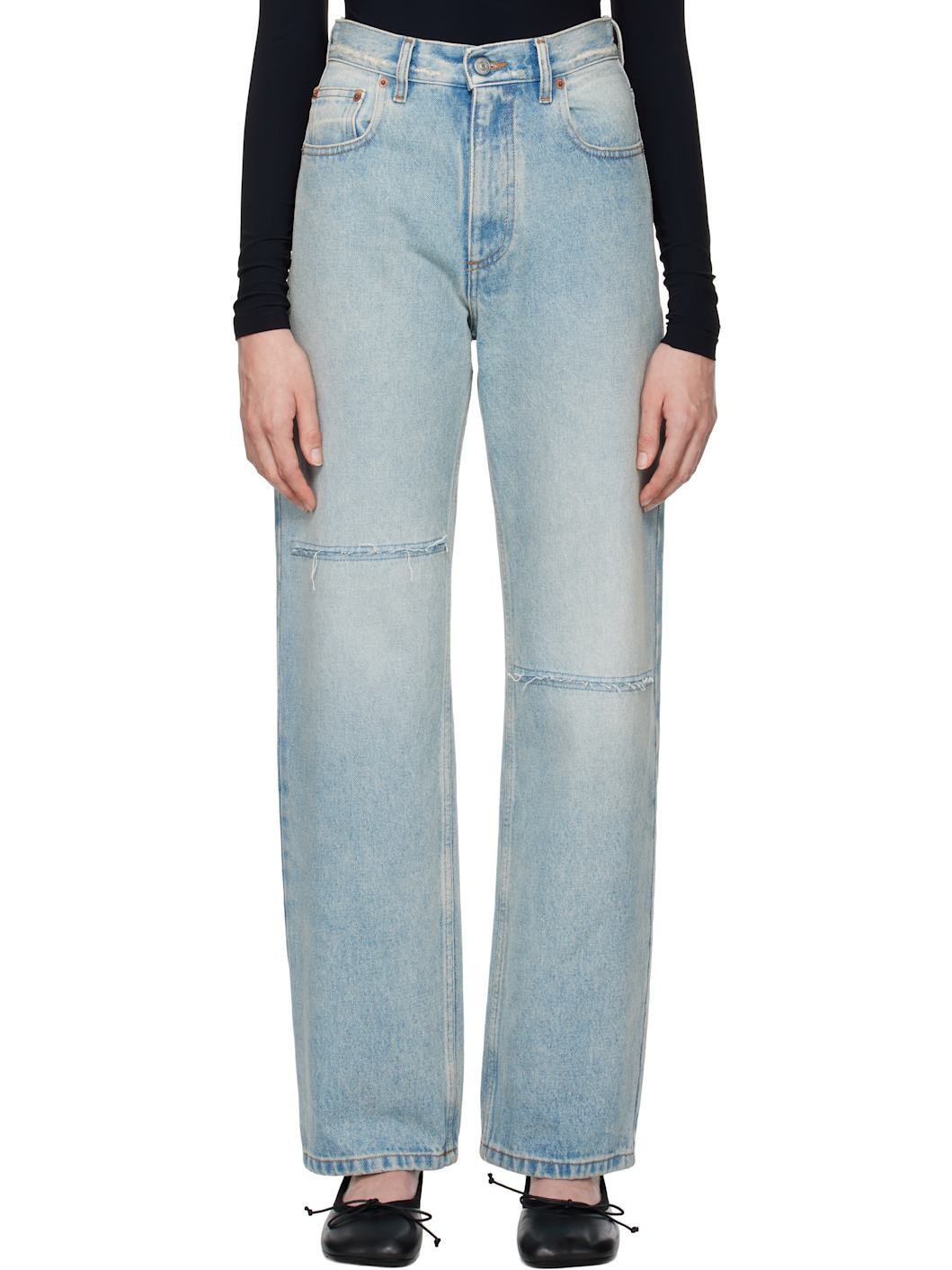 Straight-leg non-stretch denim jeans. Fading throughout. · High-rise · Belt loops · Distressing at waist · Five-pocket styling · Zip-fly · Rip with frayed edges at knees · White stitching at back Supplier color: Light blue Body: 100% cotton. Lining: 65% polyester, 35% cotton. Made in Italy 242188F069024