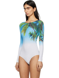 Stretch nylon jersey bodysuit. Graphic pattern printed throughout. · Crewneck · Logo flag at side seam · Press-stud fastening at bottom · White stitching at back collar Supplier color: Blue/White/Green 73% polyamide, 27% elastane. Made in Italy 251188F358002