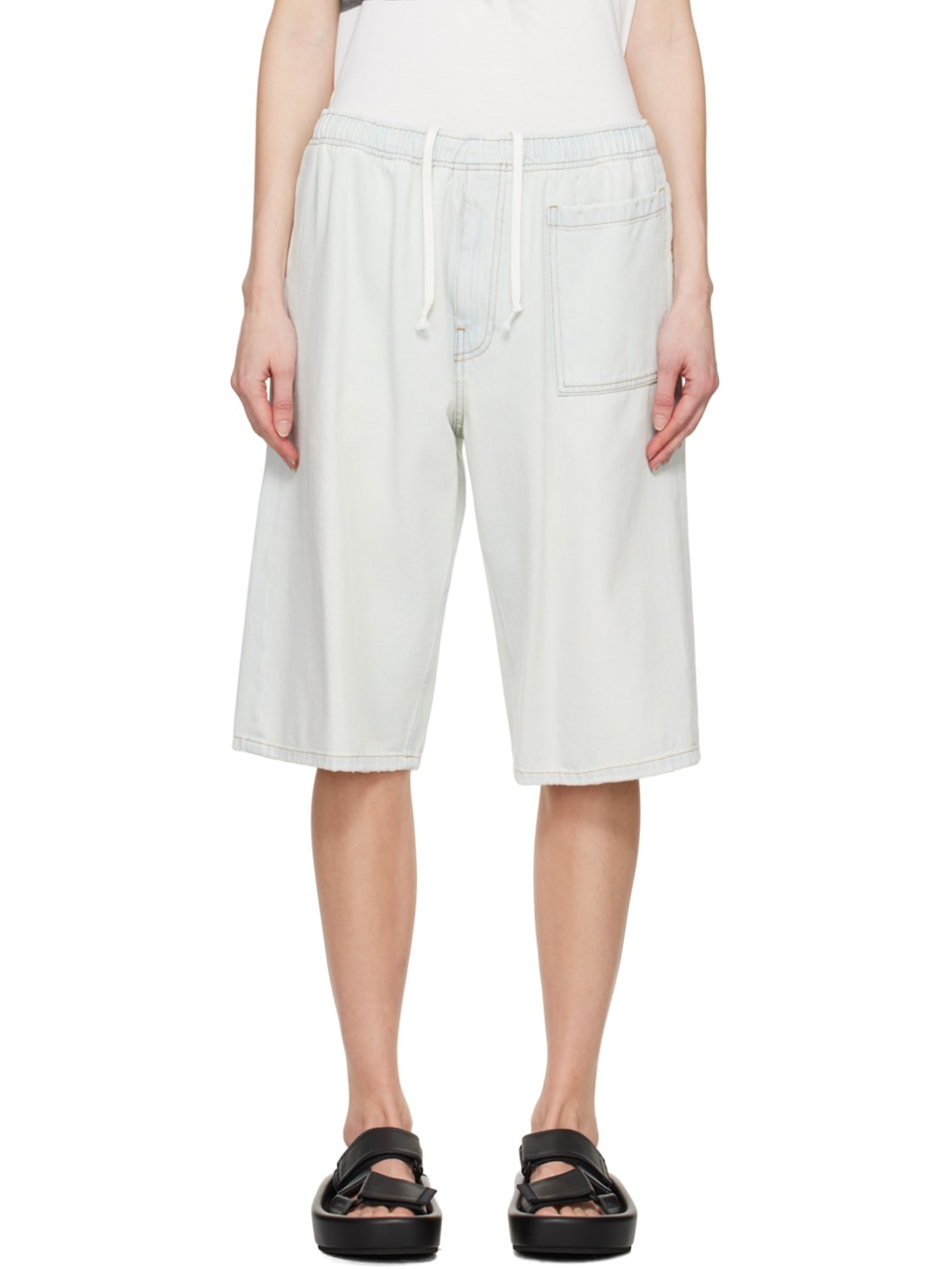 Non-stretch denim shorts. Fading throughout. · Concealed drawstring at elasticized waistband · Four-pocket styling · Zip-fly · Subtle distressing at cuffs · White stitching at back · Contrast stitching in tan Supplier color: Light blue Body: 100% cotton. Lining: 65% polyester, 35% cotton. Made in Italy 241188F088008