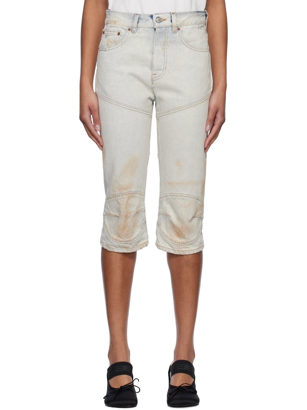 Non-stretch denim shorts. Fading, smudging, and subtle distressing throughout. · Paneled construction · Belt loops · Three-pocket styling · Button-fly · Darts at knees · Jacron logo patch at back waistband · White stitching at back · Contrast stitching in tan Supplier color: Light blue 100% cotton. Made in Italy 251188F088000