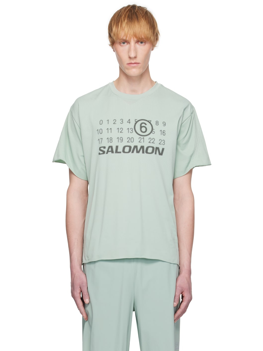 Textured nylon jersey T-shirt. · Seamless construction · Rib-knit crewneck · Logos printed at front and back · Rolled edge at hem and cuffs · Dropped shoulders · White stitching at back collar Part of the MM6 Maison Margiela x Salomon collaboration. Supplier color: Light blue 100% nylon. Made in Turkey 252188M213002