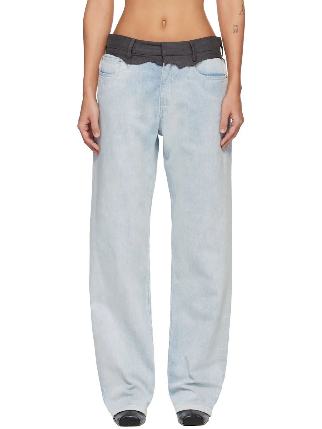Stretch denim jeans. · Paneled construction · Fading throughout · Raw edge at wool twill waistband · Belt loops · Five-pocket styling · Zip fly · White stitching at back waistband · Logo patch at back pocket Supplier color: Light blue Body: 98% cotton, 2% elastane. Trim: 65% polyester, 35% cotton. Made in Romania 261188F069003