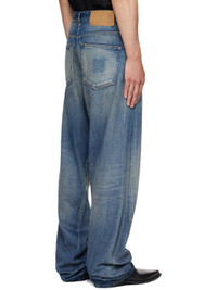 Non-stretch denim jeans. · Fading and whiskering throughout · Wide-leg · High-rise · Belt loops · Five-pocket styling · Zip fly · Twisted outseams · Logo patch at back waistband · White stitching at back waist · Contrast stitching in tan Supplier color: Medium blue 100% cotton. Made in Italy 252188M186004