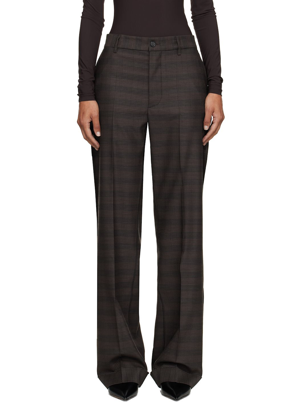 Stretch virgin wool-blend flannel trousers. · Check pattern throughout · Belt loops · Four-pocket styling · Zip fly · Creased legs · Rolled cuffs · Exposed outseams · White stitching at back Supplier color: Brown/Black Body: 53% polyester, 43% virgin wool, 4% elastane. Trim: 100% cotton. Made in Italy 252188F087010
