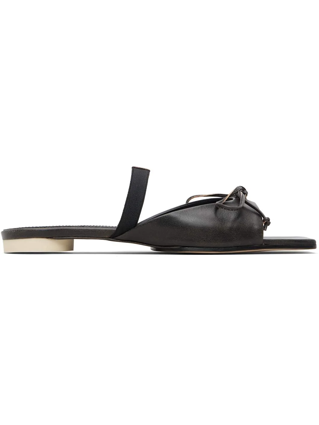Buffed leather flat sandals. · Fading throughout · Open square toe · Strap with bow at vamp · Elasticized strap with logo patch · Logo embossed at footbed · Buffed leather lining · Polished leather sole with rubber injection Supplier color: Brown Leather. Made in Italy 261188F124007