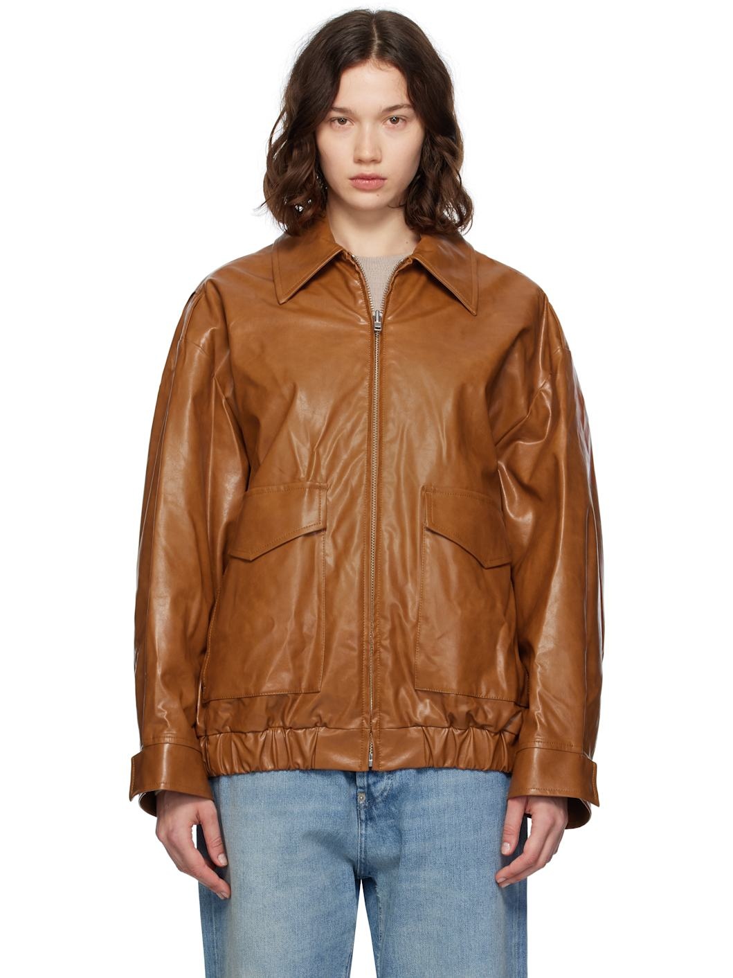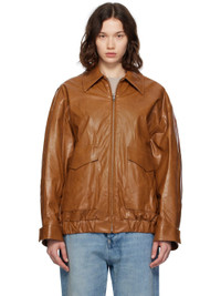 Brown Oversized Faux-Leather Bomber Jacket