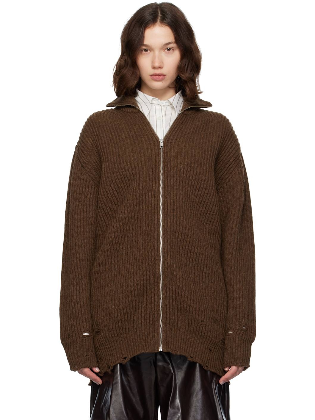 Rib-knit wool-blend sweater. · Stand collar · Zip closure at front · Frayed edges at hem and cuffs · Dropped shoulders · White stitching at back collar Supplier color: Brown 80% wool, 20% polyamide. Made in Italy 252188F099009