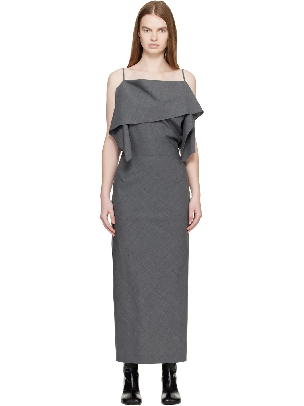 Wool-blend chambray maxi dress. · Foldover at waist for alternate function as skirt · Spaghetti straps · Asymmetrical panel at neck · Darts at front and back waist · Self-tie fastening at waist · Zip at back waist · Unlined · White stitching at back waist Supplier color: Dark Grey 54% polyester, 44% wool, 2% elastane. Made in Italy 261188F055000