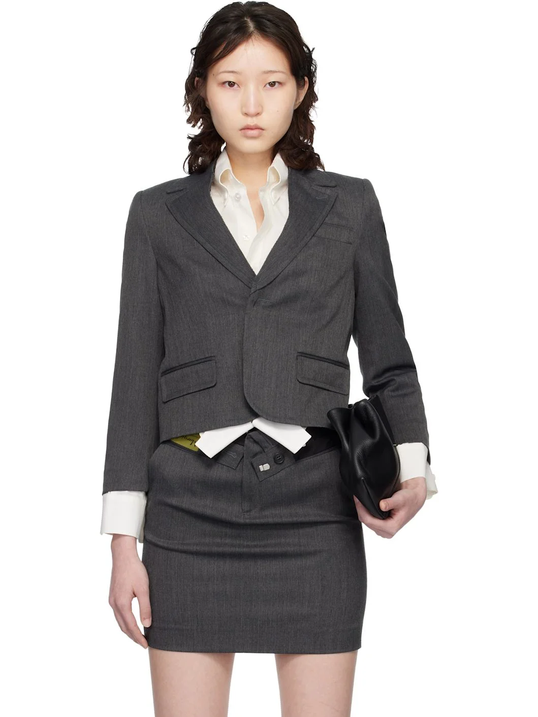 Stretch virgin wool-blend blazer. · Raw edge at peaked lapel · Welt pocket at chest · Flap pockets at waist · Cropped hem · White stitching at back yoke · Button pocket at interior · Full satin lining Supplier color: Dark Grey Melange 54% polyester, 44% virgin wool, 2% elastane. Made in Portugal 261188F057003