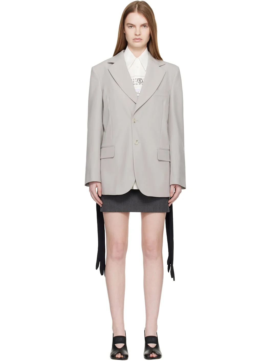 Virgin-wool blend canvas blazer. · Notched lapel · Button closure · Welt pocket at chest · Darts at front · Belt loops and flap pockets at waist · Mock gloved sleeves at waist · Padded shoulders · Surgeon's cuffs · White stitching at back collar · Welt pocket at interior · Satin twill lining Supplier color: Light Grey Body: 55% polyester, 45% virgin wool. Lining: 100% viscose. Made in Italy 261188F057002