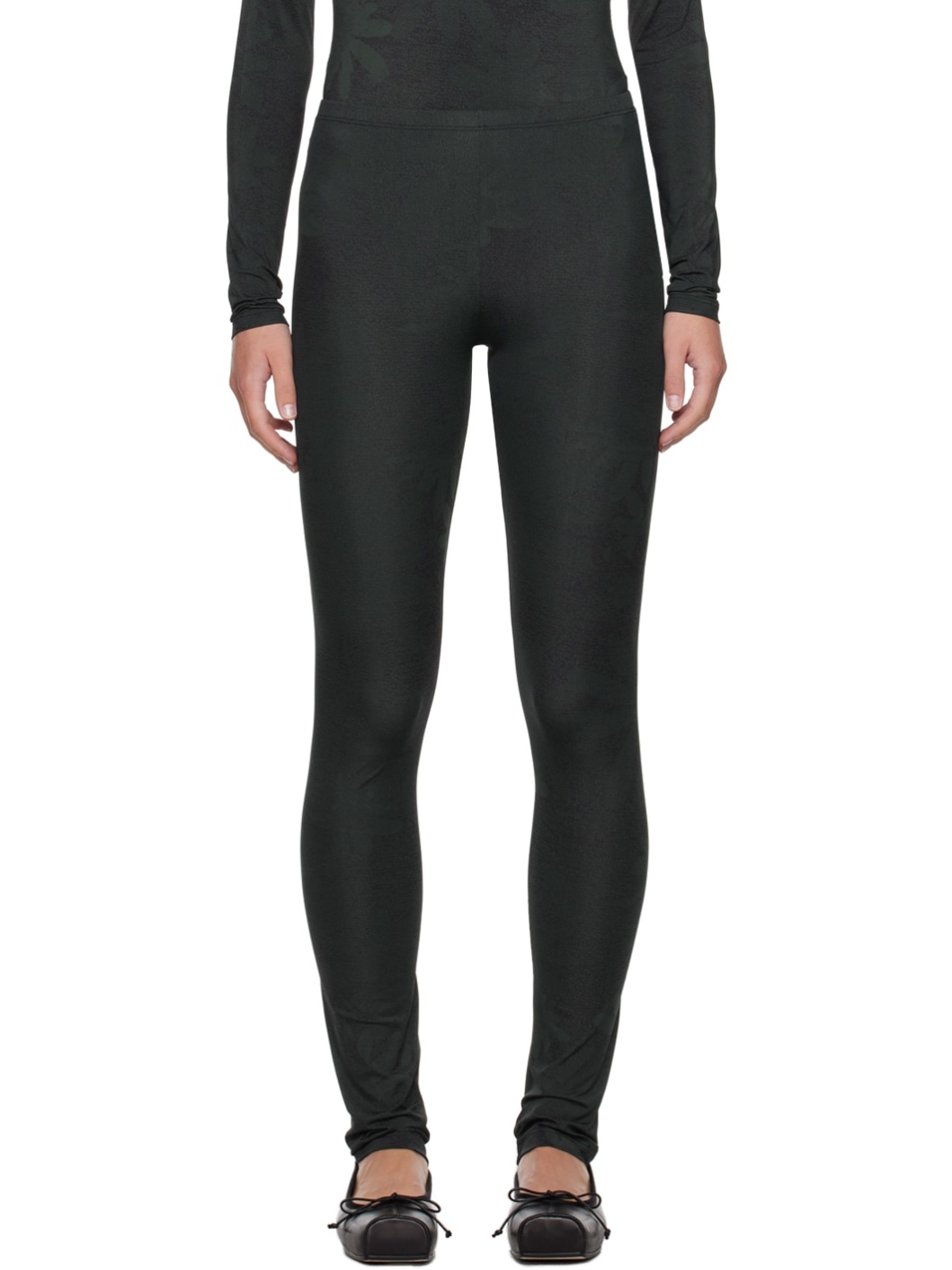 Stretch nylon jersey leggings. Graphic pattern printed throughout. · Elasticized waistband · White stitching at back waistband Supplier color: Green/Black
