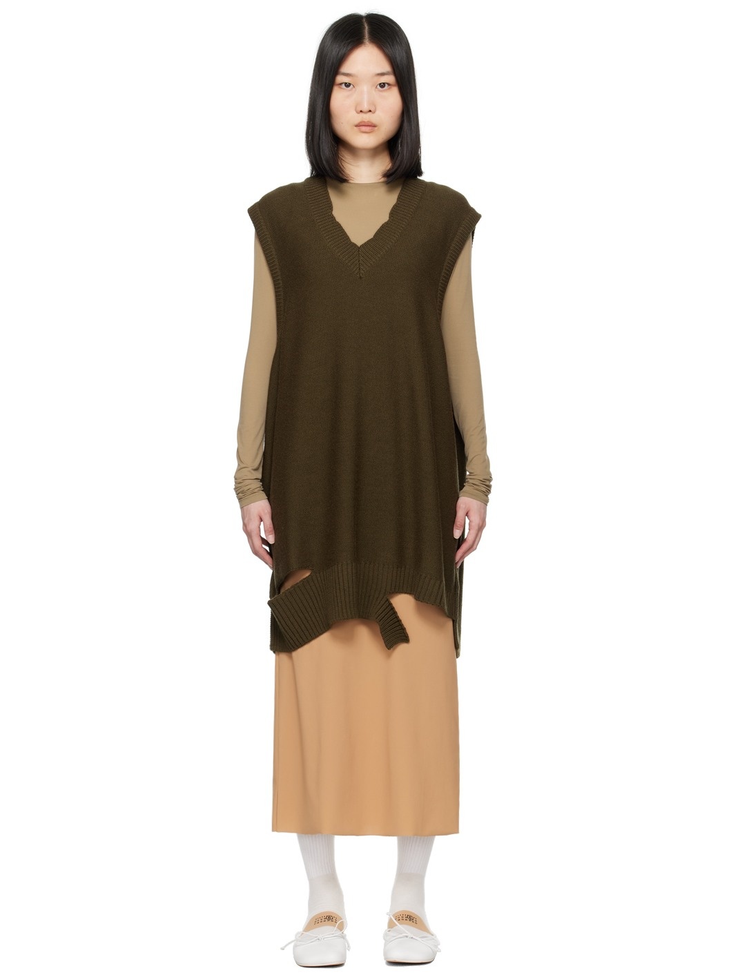 Knit acrylic- and virgin wool-blend dress. Distressing throughout. · Rib knit V-neck, hem, and armsyces · Cutout at asymmetric hem · Exposed side seams · White stitching at back collar Supplier color: Khaki 50% acrylic, 50% virgin wool. Made in Italy 242188F052018